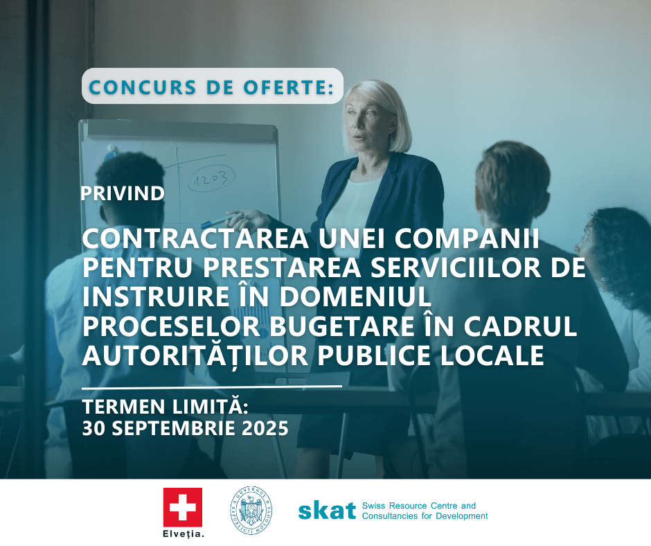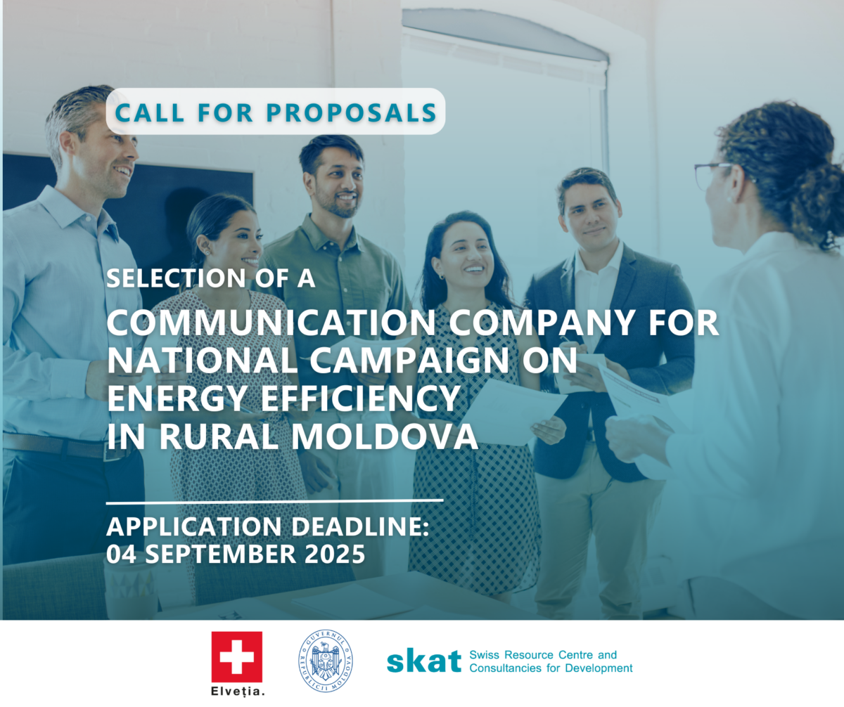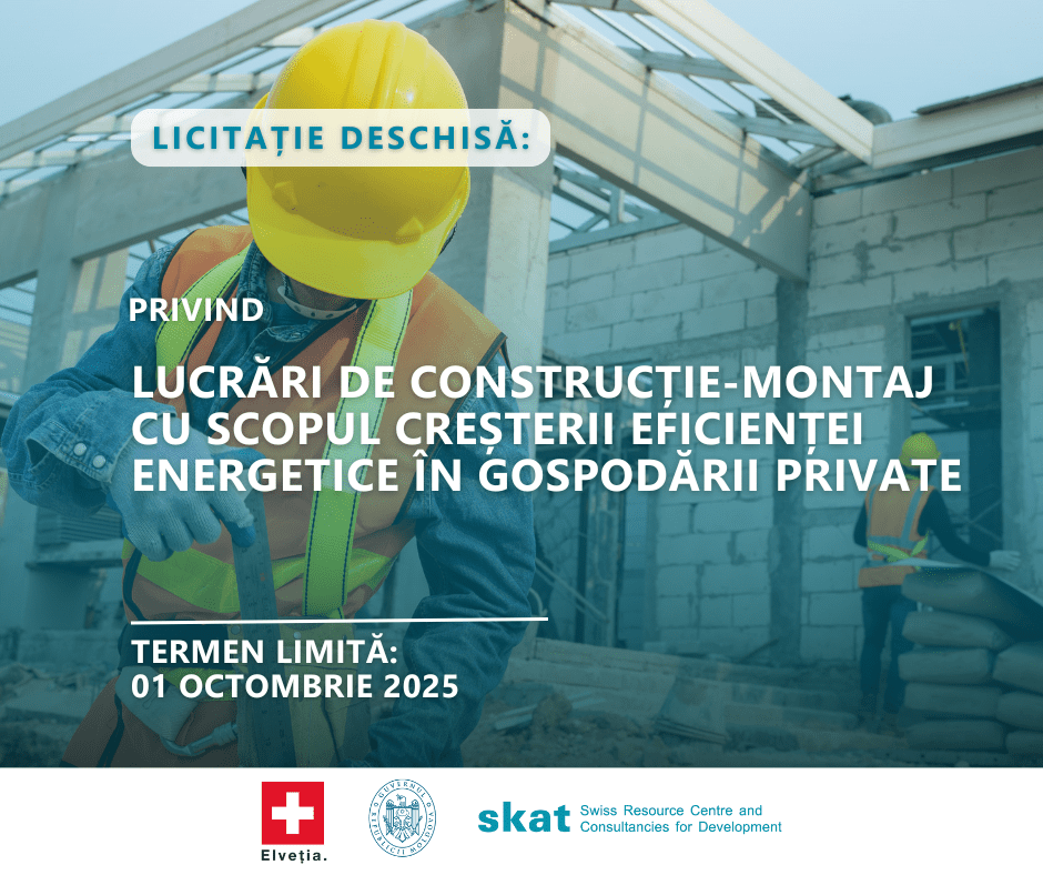 Tender Licitație deschisă privind achiziționarea: Lucrări de construcție-montaj cu scopul creșterii eficienței energetice în gospodării private Contractarea unei companii / instituții pentru prestarea serviciilor de instruire în domeniul proceselor bugetare în cadrul autorităților publice locale (APL) Call for Proposals – Selection of a Communication Company for the National Communication Campaign on Energy Efficiency for Rural Moldova Contractarea unei companii de comunicare pentru prestarea serviciilor de mentorat în comunicare publică pentru autoritățile publice locale (APL) MĂ IMPLIC Project Phase 2seeks to contract a Capacity Development Advisor Open Competitive Selection of a consultant: Component Manager for Water, Sanitation and Energy Efficiency Request for Proposals: Public Information and Awareness Campaign on Waste Management – within the MĂ IMPLIC Project, Phase II MĂ IMPLIC Project, Phase II is hiring a Legal Advisor on national reforms and public administration Anunț de participare la licitația deschisă pentru realizarea lucrărilor de construcție din cadrul sistemului de alimentare cu apă (SAA) a s. Satul Nou, r. Cimișlia Anunț de participare la licitația deschisă pentru realizarea lucrărilor de construcție a rețelelor exterioare de alimentare cu apă și a branșamentelor individuale pentru gospodării din satul Bădiceni, raionul Soroca MĂ IMPLIC Project, Phase II is hiring a Consultant on Assessment of Financial Sustainability of Public Service Provision Skat Moldova Foundation is hiring an Office Manager TERMEN EXTINS: Concurs pentru pentru selectarea unei companii specializate pentru procurarea instalațiilor de panouri fotovoltaice Concurs pentru selectarea unei companii de construcții: lucrări de construcție-montaj pentru creșterea eficienței energetice la la clădirea Primăriei Telița din raionul Anenii Noi (OCT 2024) Concurs pentru selectarea unei companii de construcții: lucrări de construcție-montaj pentru creșterea eficienței energetice la la gospodării private în 4 localități din raionul Fălești (OCT 2024) Concurs pentru selectarea unei companii de construcții: lucrări de construcție-montaj pentru creșterea eficienței energetice la Grădinița nr. 2 din Vorniceni, raionul Strășeni (SEP 2024) Concurs pentru pentru selectarea unei companii specializate pentru procurarea instalațiilor de panouri fotovoltaice Concurs pentru selectarea unei companii de construcții: lucrări de construcție-montaj pentru creșterea eficienței energetice la clădirea Primăriei Lozova (SEP 2024) Concurs pentru selectarea unei companii de construcții: lucrări de construcție-montaj pentru creșterea eficienței energetice la gospodării private în 11 localități din țară (AUG 2024) Licitația deschisă: servicii de lucrări de construcții-montaj pentru creșterea eficienței energetice (Volintiri, August 2024) Licitația deschisă: servicii de lucrări de construcții-montaj pentru creșterea eficienței energetice (Primăria sat. Nișcani, IUNIE 2024) Contractarea serviciilor de consultanță și coordonare a activităților proiectului MĂ IMPLIC în grupurile de APL-uri partenere Licitația deschisă: servicii de lucrări de construcții-montaj pentru creșterea eficienței energetice (Grădinița #12 din or.Bălți, MAI 2024) Licitația deschisă: servicii de lucrări de construcții-montaj pentru creșterea eficienței energetice (Grădinița „Andrieș” din s. Borogani, r. Leova, MAI 2024) Licitația deschisă: servicii de lucrări de construcții-montaj pentru creșterea eficienței energetice (Nișcani, Vorniceni, APR 2024) Licitația deschisă: servicii de consultanță pentru dezvoltarea, producția și diseminarea materialelor informative (Aprilie 2024) Licitația deschisă: servicii de lucrări de construcții-montaj pentru creșterea eficienței energetice (Colibași, APR 2024) Protejat: Tender03 TERMEN EXTINS – Licitație deschisă pentru achiziția a șase autospeciale pentru colectarea și transportarea deșeurilor menajere